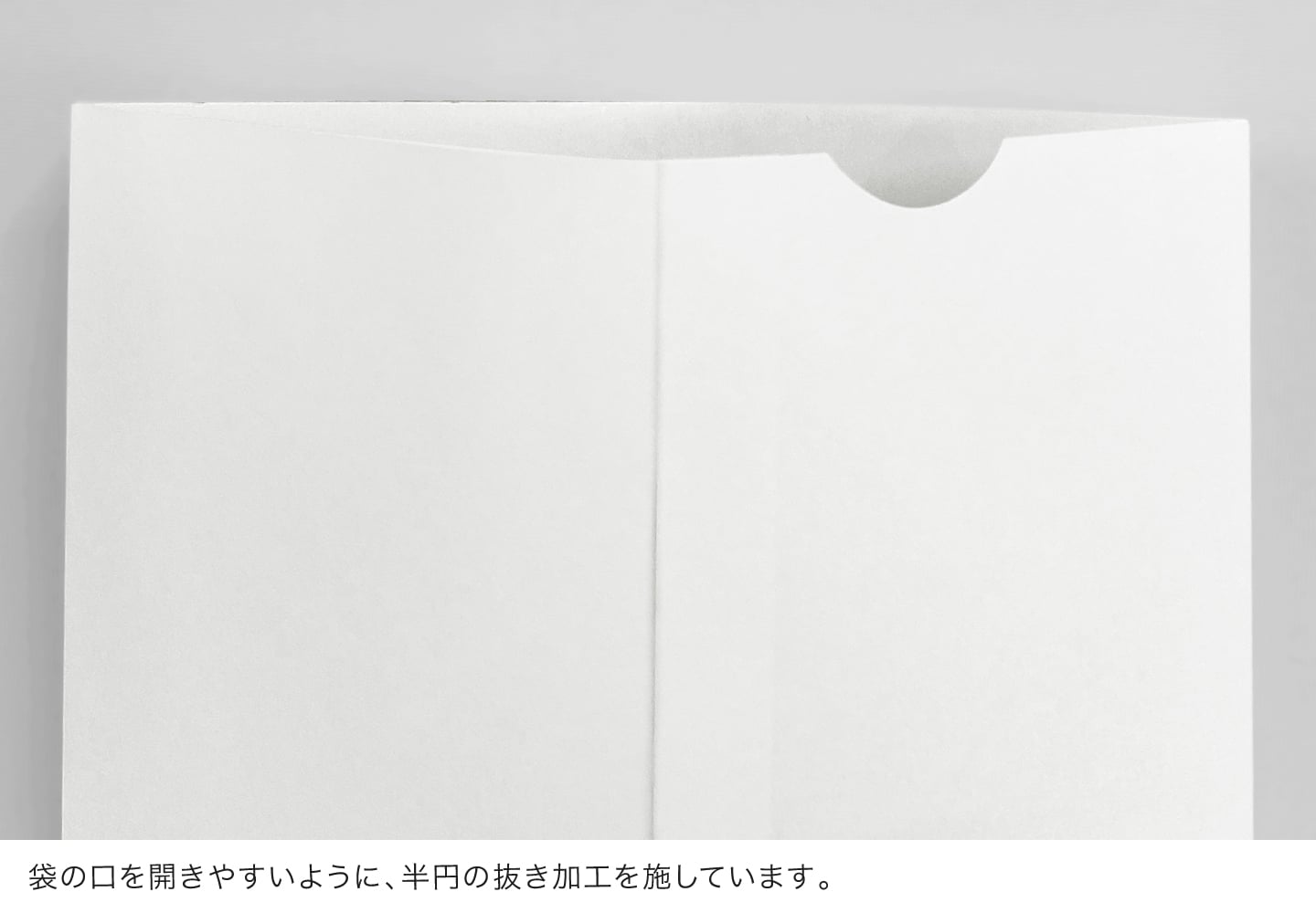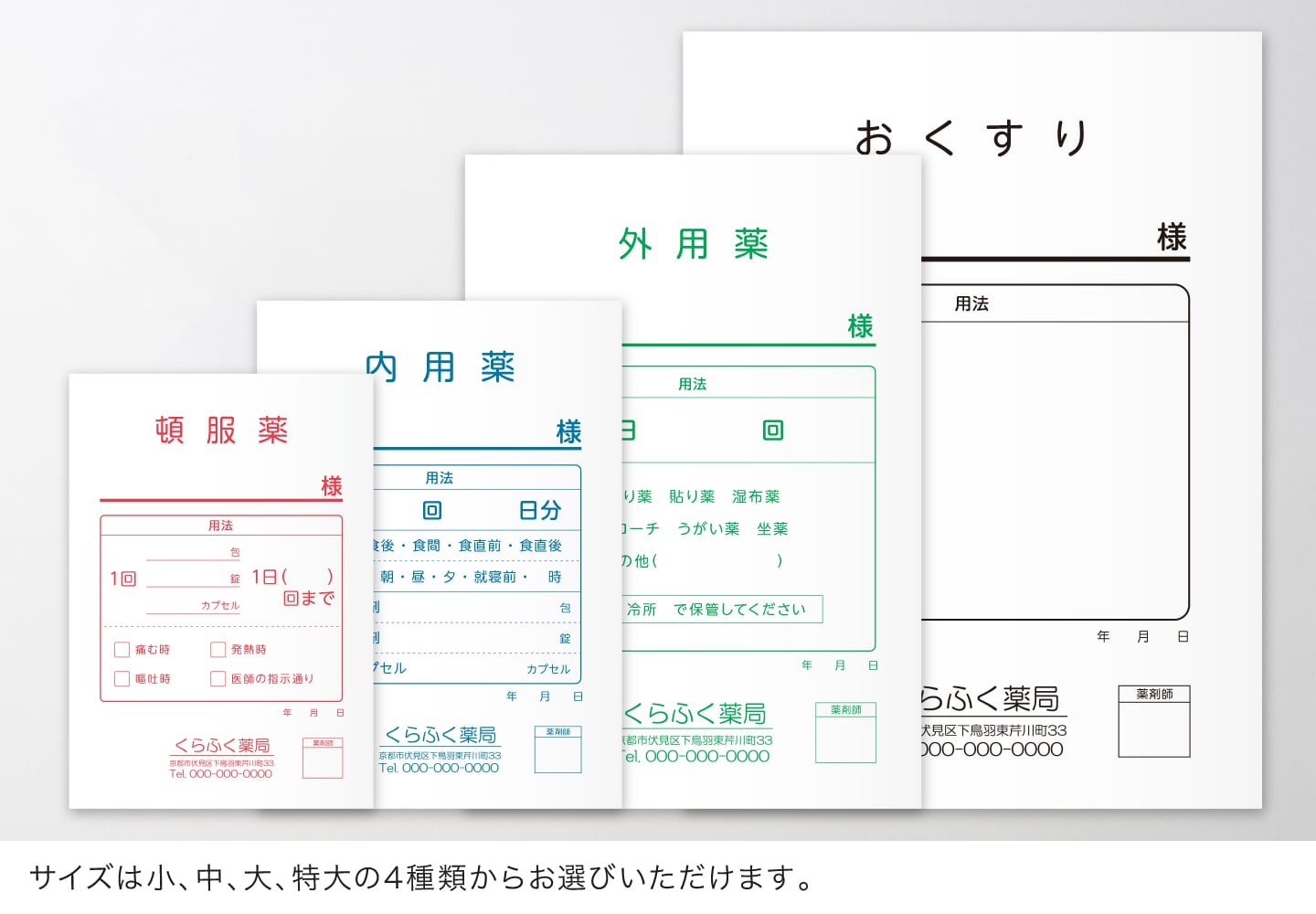 薬局やクリニックでの薬の受け渡しに欠かせない薬袋、雑貨店で扱う小物の包装にオススメの平袋をリーズナブルに作成できます。サイズは小、中、大、特大の4種類をご用意。用紙は鉛筆などでの筆記がしやすい上質紙となります。袋の口を開きやすいように、半円の抜き加工を施しています。