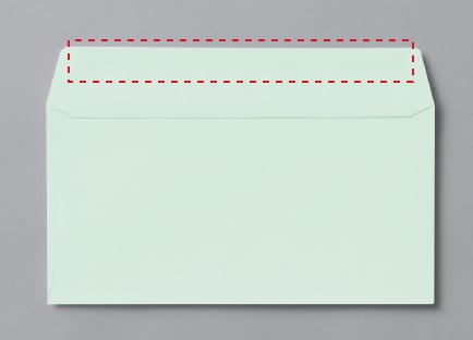 刷込封筒は既存の封筒の表側に印刷されます。仕上がりから5mm内側であれば印刷は可能ですが、のり付け部分は紙が重なり、厚みが変わってきますので着色部分に段差が生じる場合があります。また、長3サイズでは郵便枠が印字されておりますので、その付近のレイアウトは避けてください。当社テンプレートのガイドはその部分を考慮して作成しています。