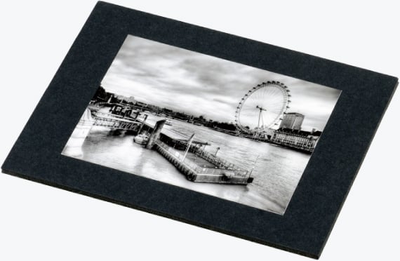 展示用フルセットの構成:上層から、アクリル(透明)/出力作品/塩ビ(ブラック)/浮かし下駄という順に重ねます。