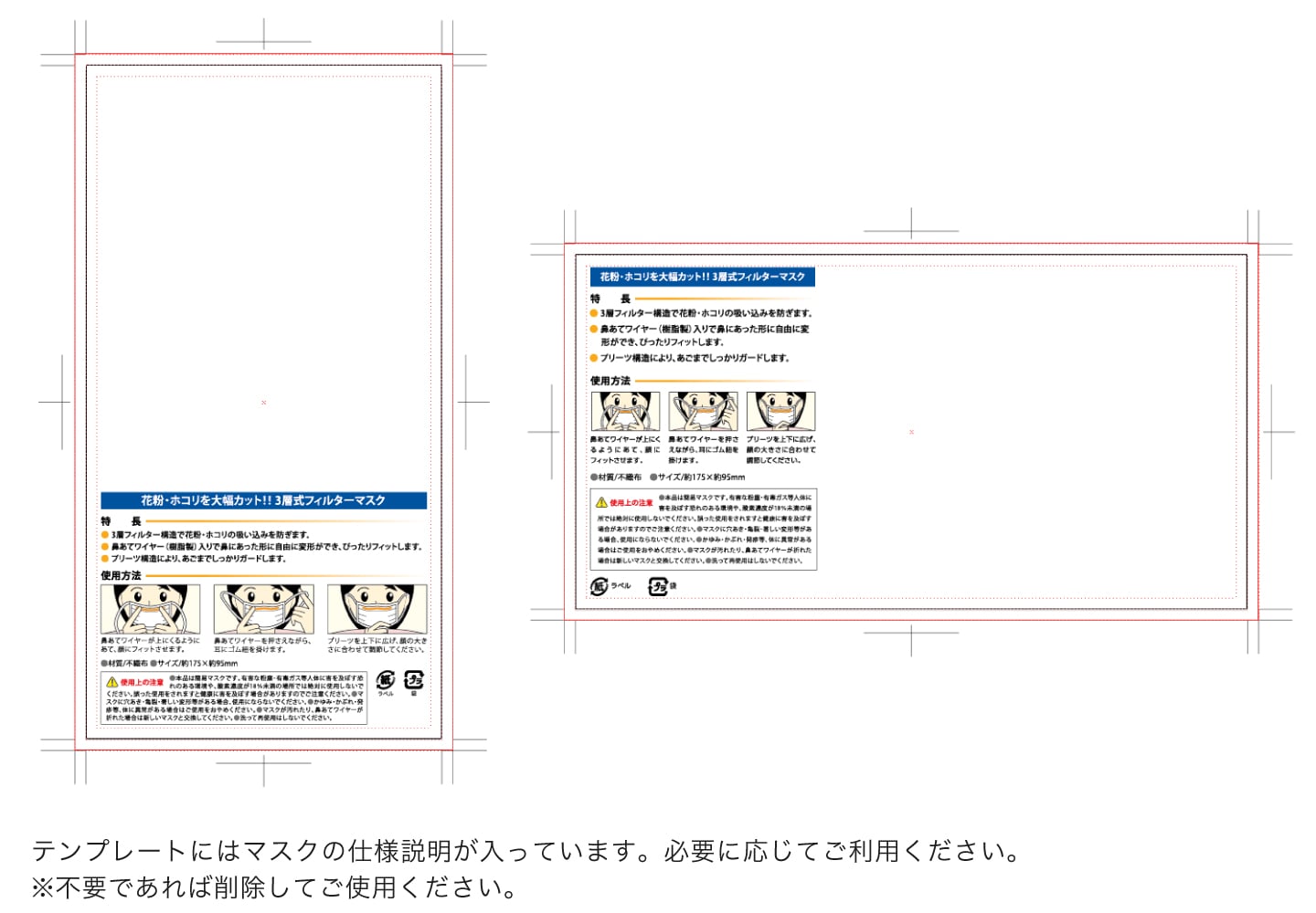 | サイズ | ラベルサイズ:95×180mm中身のマスクとほぼ同じ大きさのレギュラータイプ。ビジュアルやテキストを十分に盛り込める広告スペースがあります。 ![]() 二つ折サイズ:95×250mm(70mmで折り返し)折り返しのついたワイドタイプ。使用上の注意や正しい着用方法の明記を折り返し部分に配置すれば、片面全面をPRに活用できます。