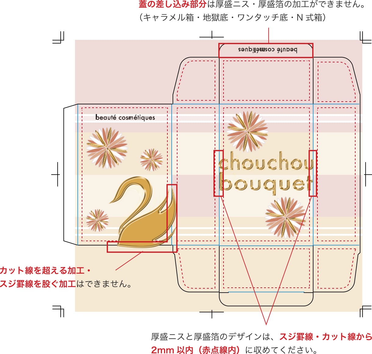 - 厚盛ニスと厚盛箔のデザインは重なっても加工は可能です。(加工順は、厚盛箔→厚盛ニスとなります。)