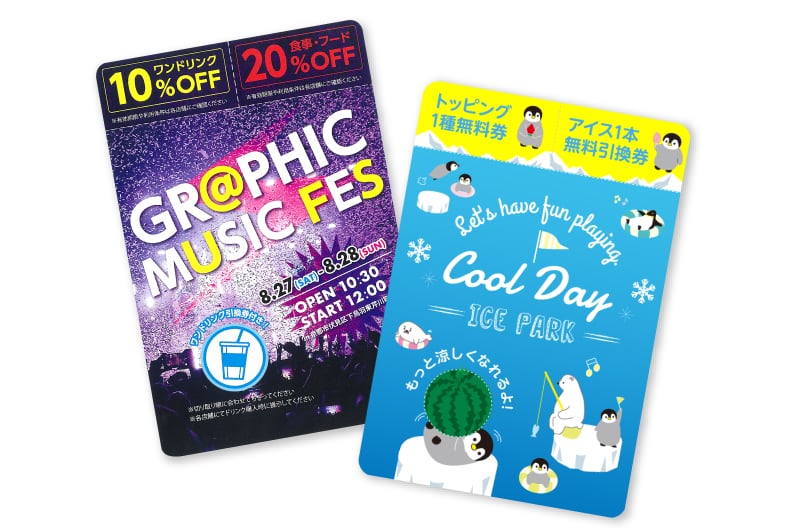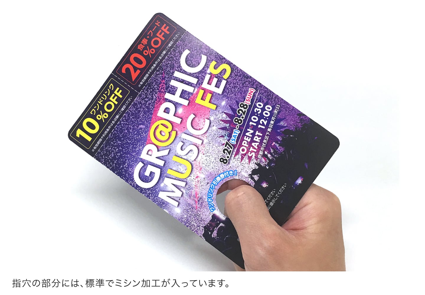 持ち運びしやすいはがきサイズで、軽くてエコな紙製うちわです。印刷上部や指穴部分は、クーポンやチケットなどに利用できるミシン加工が標準でついており、イベントグッズやノベルティなど、幅広い用途でご利用が可能です。