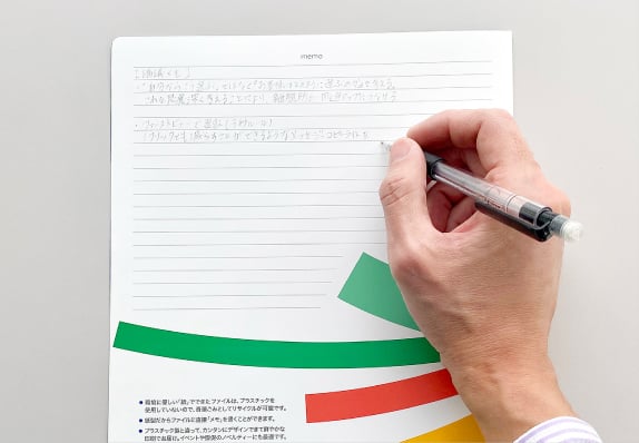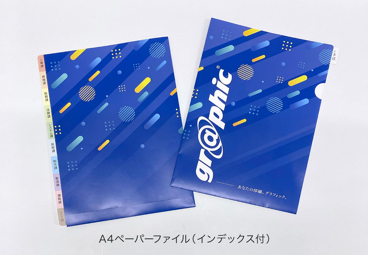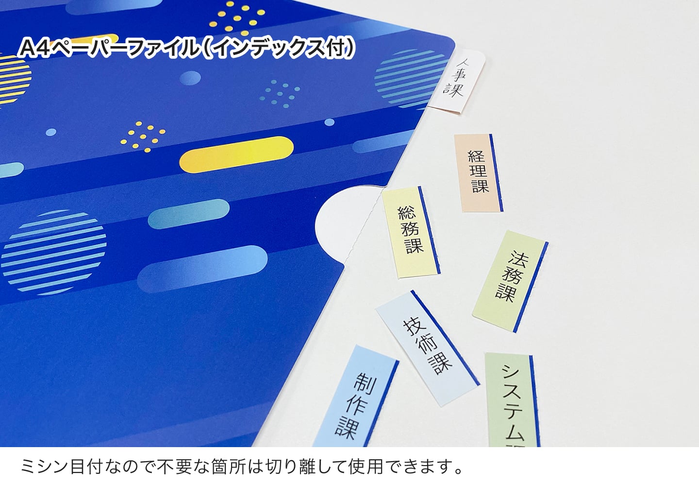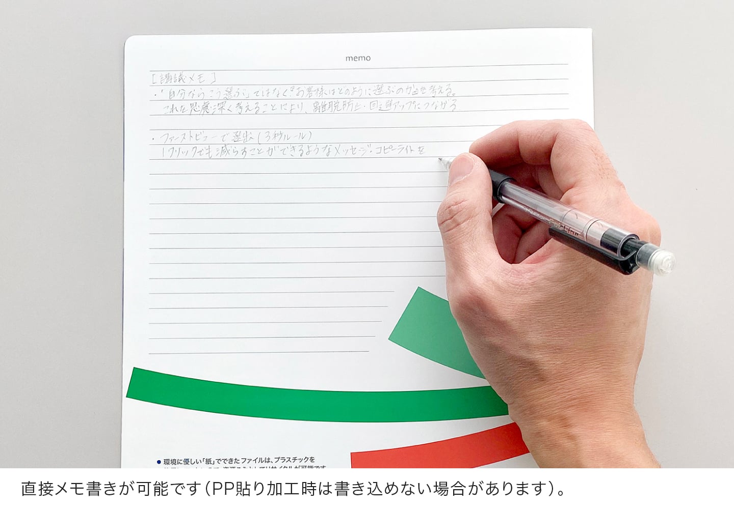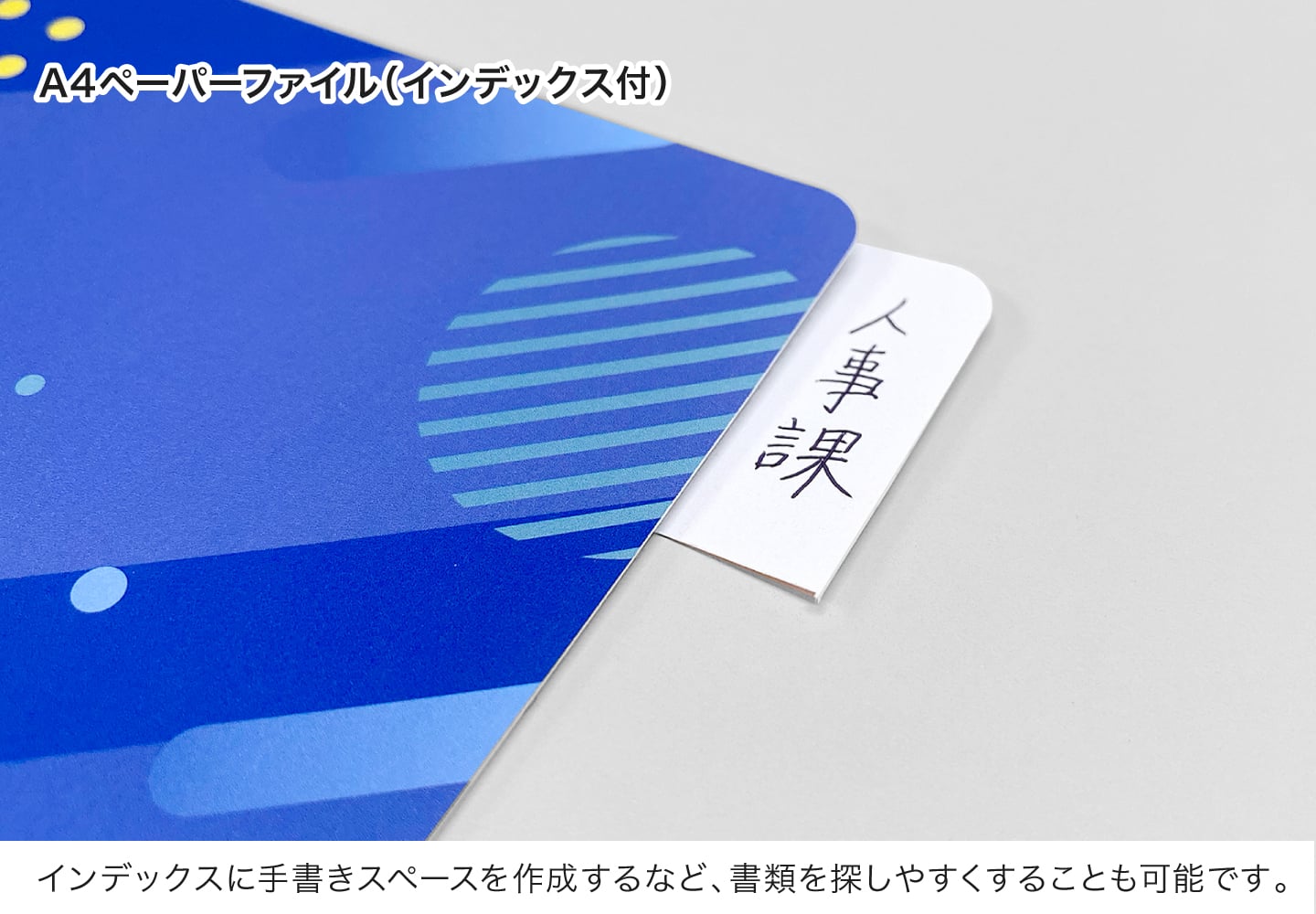 紙製のため直接メモ書きもできる実用性を備え、クリアファイルの代用品として販促ツールやノベルティにも活用いただけます。当社クリアファイルよりも低価格でご注文いただけます。インデックス付きや書類を入れたままでも内容が確認できるタイプもご用意しています。