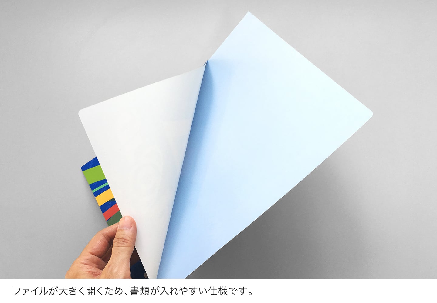 見開きタイプのファイルで、内側のフラップにA4サイズの書類を収めることができます。