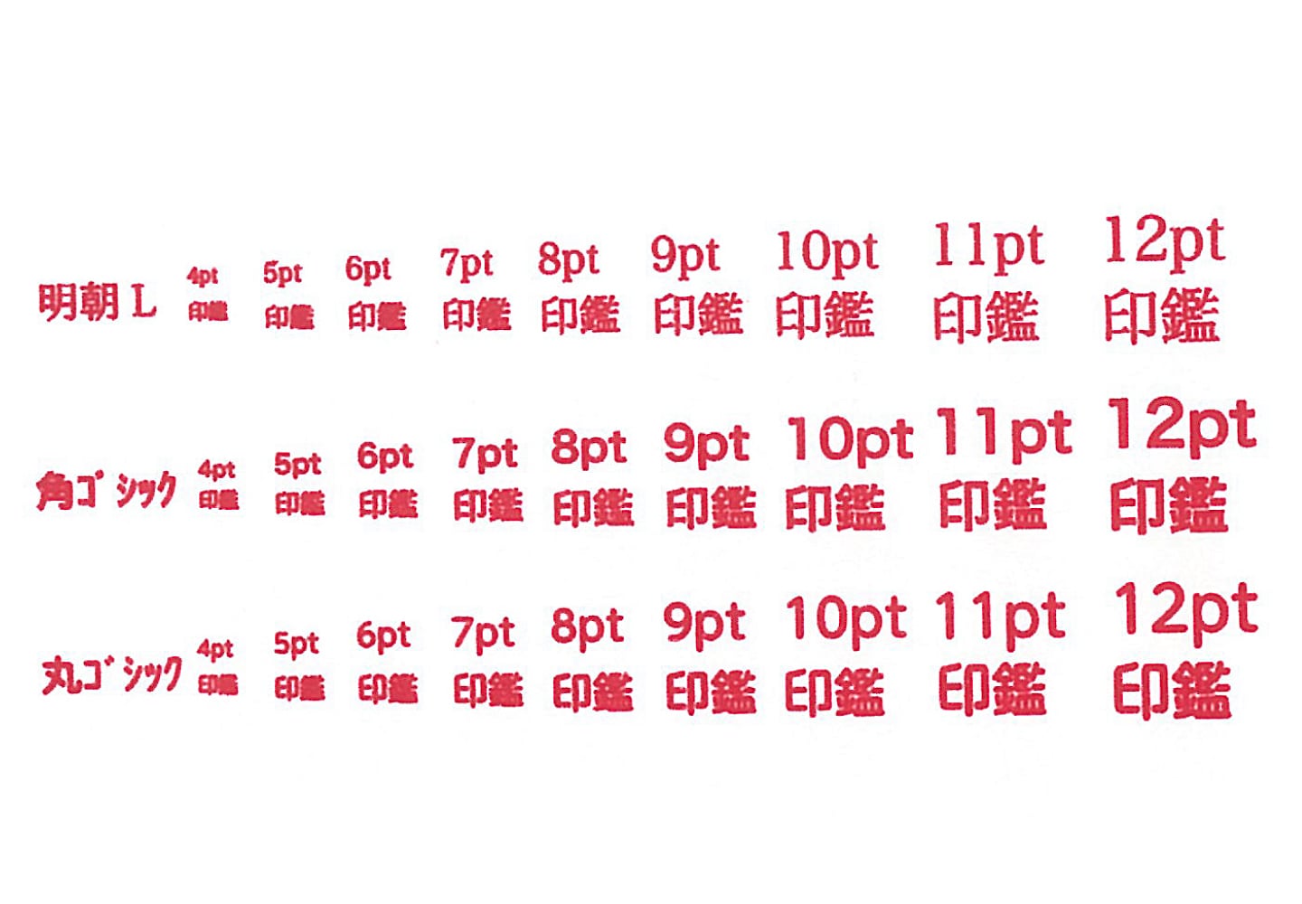 - 7.5pt(11級)以上であっても、明朝体や細いライトタイプの書体は線が細いため、文字が切れてしまい使用できない場合があります。