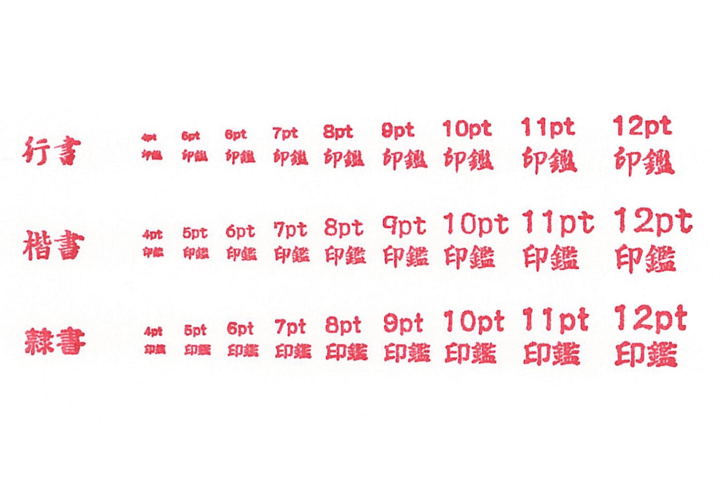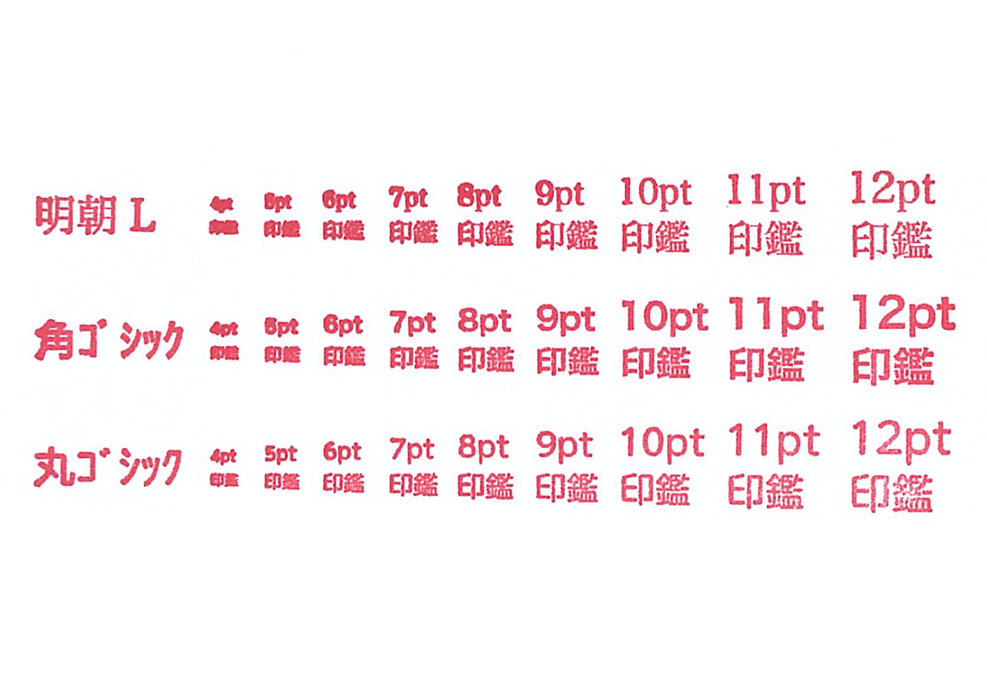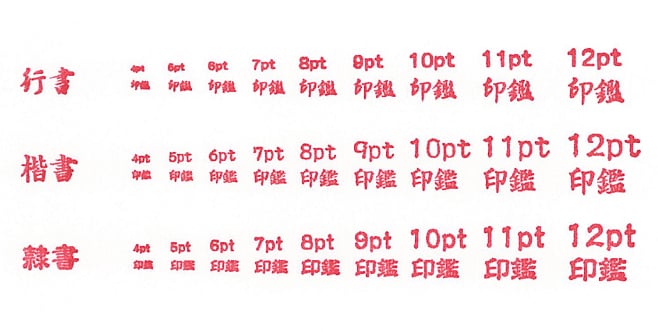 - 7.5pt(11級)以上であっても、明朝体や細いライトタイプの書体は線が細いため、文字が切れてしまい使用できない場合があります。