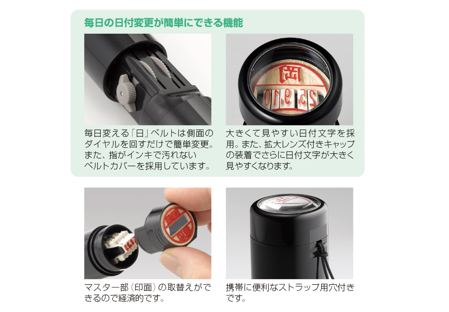 日付ダイヤルのついた12.5mmサイズのスタンプ。ひと押しで日付と名前、メッセージがなつ印できます。