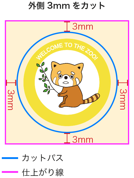 台紙カット位置の指定がない場合は、ハーフカットパスの外側およそ3mmの位置で台紙カットをさせていただきます。