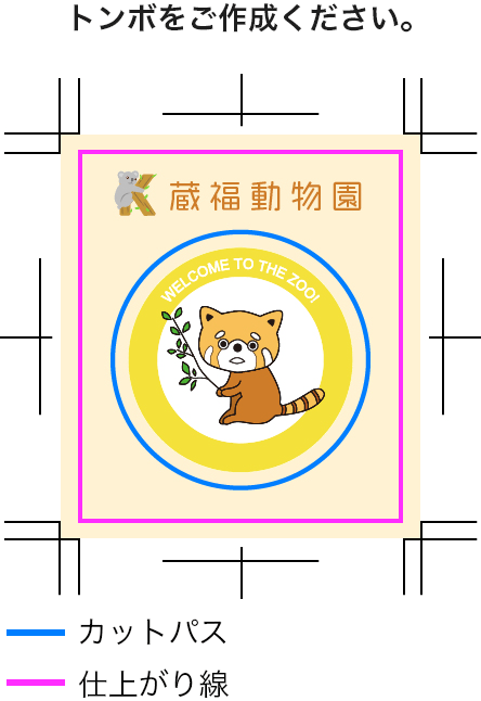 また、切れてはいけないもの(例えば文字など)はカットパスの2mm 以上内側に収めてください。