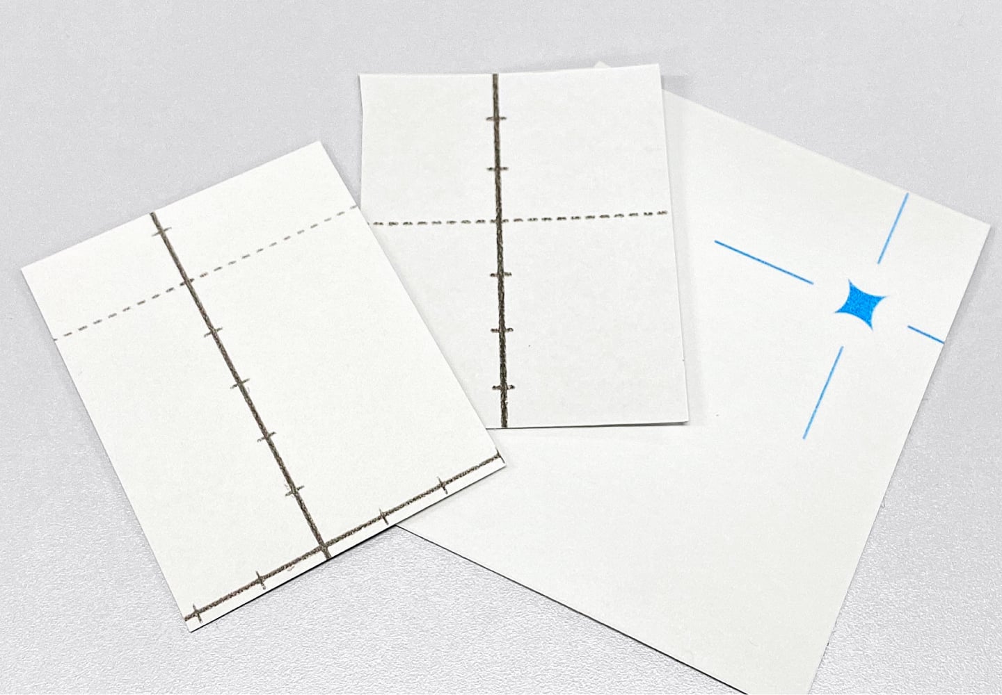 | カット方法 | 台紙サイズに指定がない場合 ハーフカットの外側3mmの位置を目安に台紙をカットします。 ![]() 台紙サイズに指定があるもしくはハーフカットなしでご注文の場合 トンボを作成いただき、ご指定の位置にて台紙をカットします。 ハーフカットの形状にかかわらず、台紙は四角形での断裁となります。 ![]() |