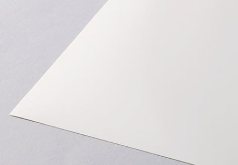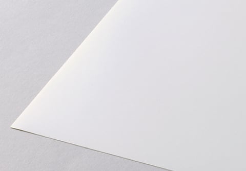 表面が印刷用に白く塗工され、若干の光沢があります。コート紙とほぼ同等。