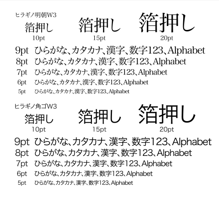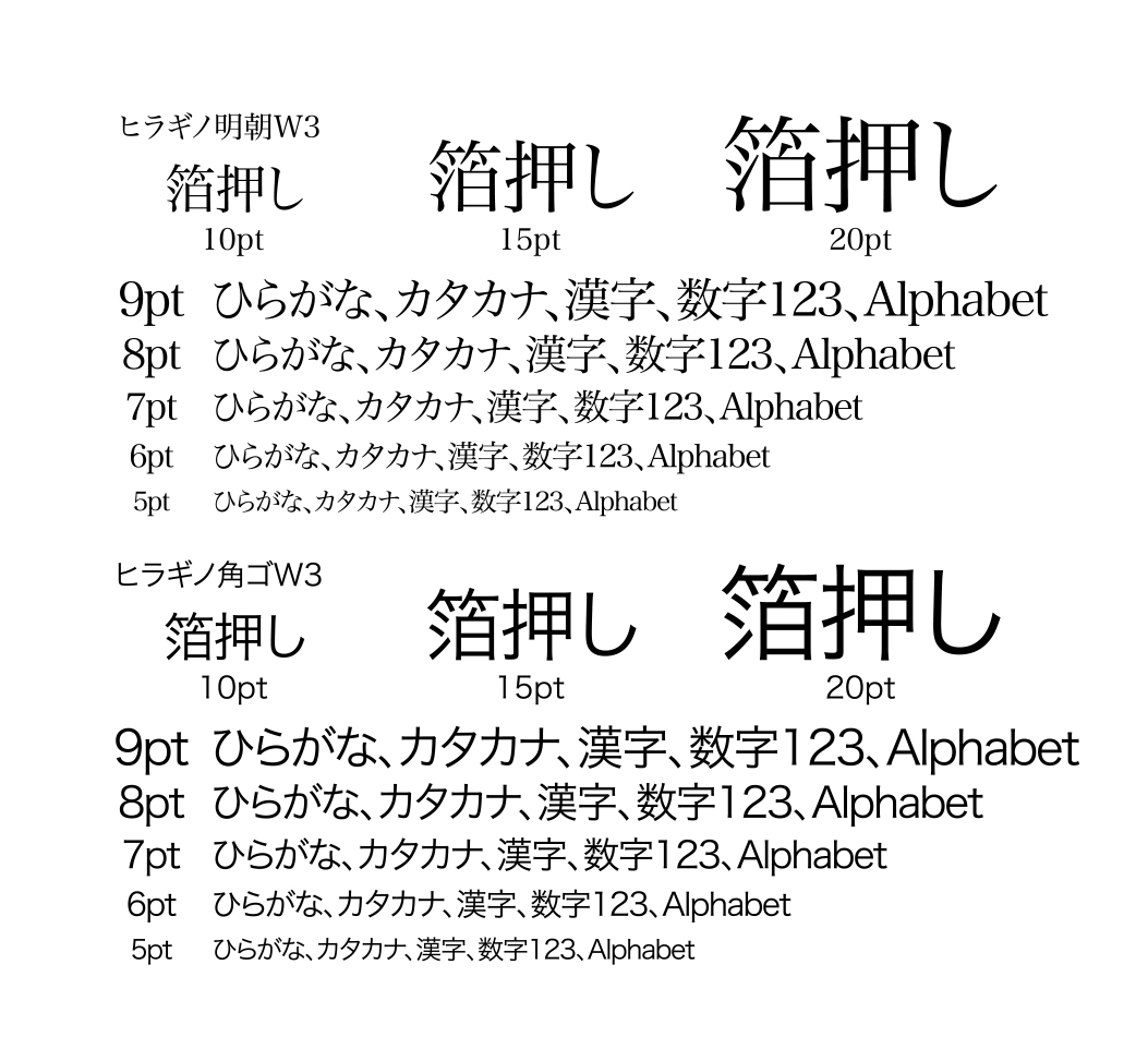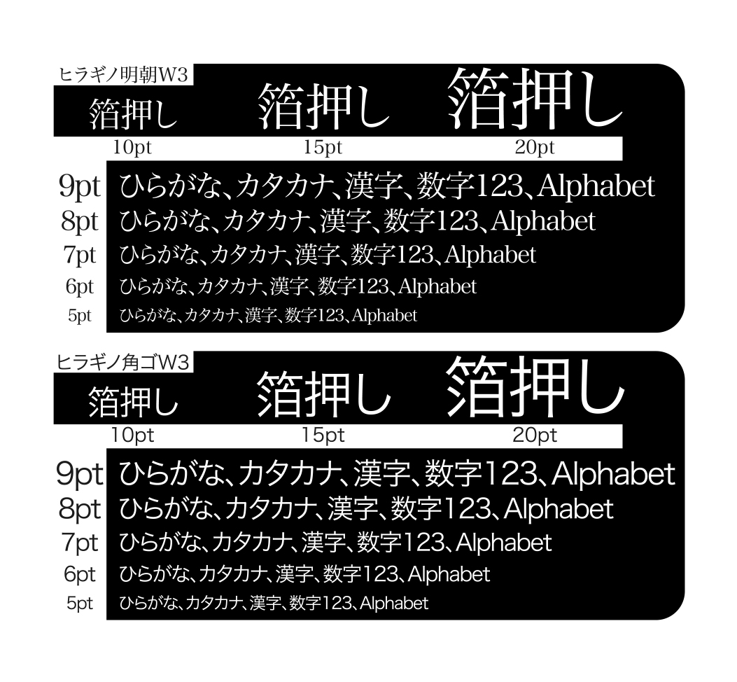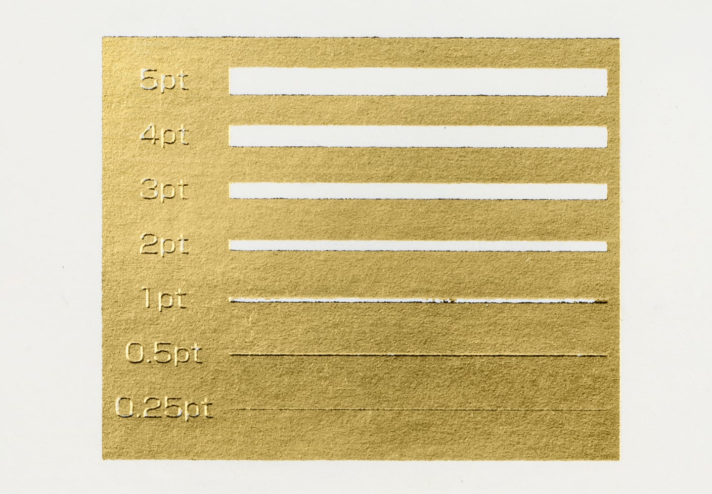- 細かな文字や模様、細い線などは、箔が潰れて再現できない場合があります。特に細かな白抜き部分は再現することが困難となります。
