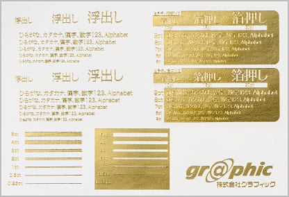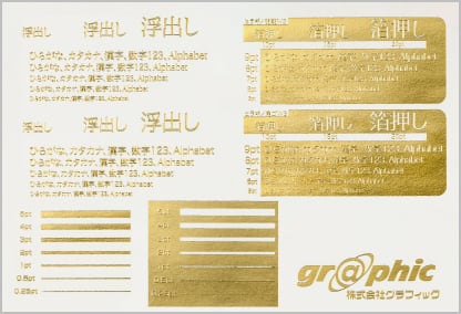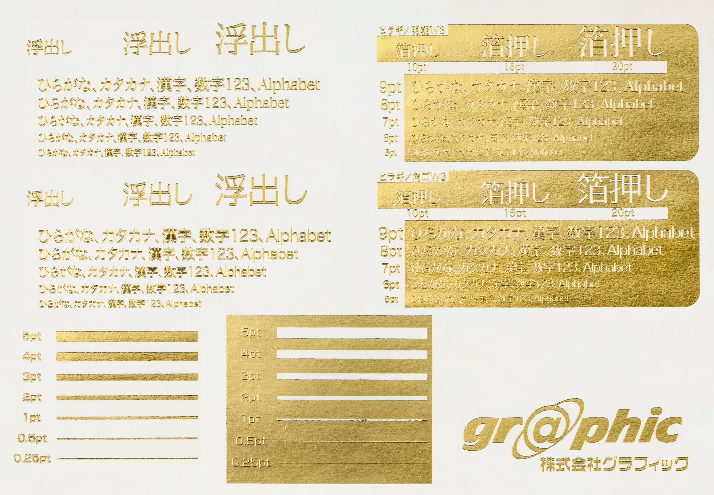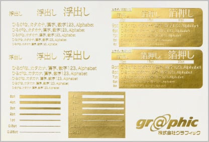 | 箔の種類 | 箔押しは、つやあり金、つや消し金、つやあり銀、つや消し銀の中から、いずれかをお選びいただけます。 | ||||||||||||||||||||||||||||||||||||||||
