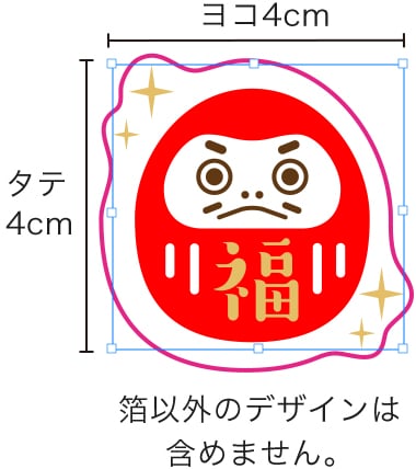 【 箔押し面積の測り方 】箔押しの面積は、箔部分をすべて選択した際のタテ(cm)×ヨコ(cm)をかけて計算します。 図のような場合、タテ4cm×ヨコ4cm=16平方cmとなり、「25平方cm」の価格帯に該当します。 ![]() 〈 上図の場合の料金例 〉上質紙シール(カラー/20平方cm以内)+箔押し(つや金/25平方cm以内)を100枚ご注文の場合 シール印刷代金 ¥2,560 (11日納期の場合) 箔押し料金 型代:¥5,000 準備代:¥4,500 単価×枚数:¥900 合計金額 ¥12,960 or 「型保管」オプションを追加した場合 ¥15,460 | ||||||||||||||||||||||||||||||||||||||||