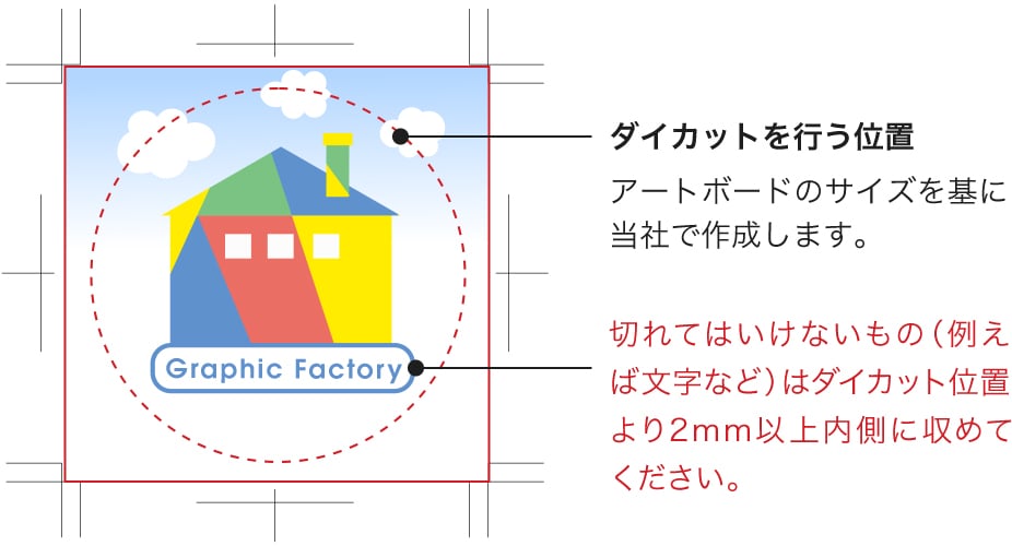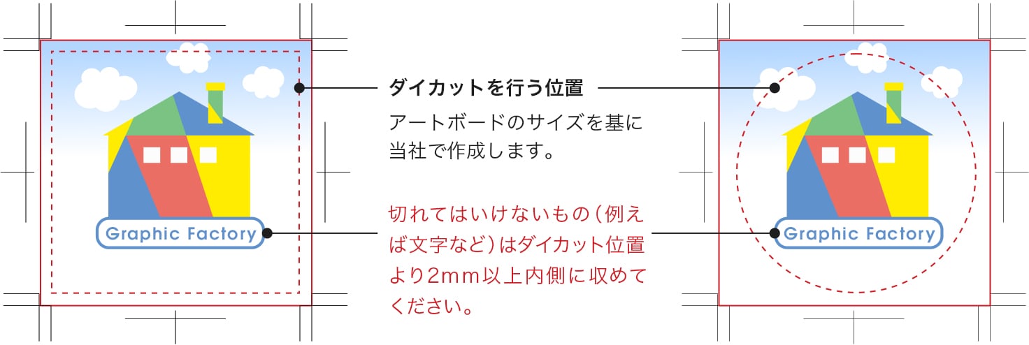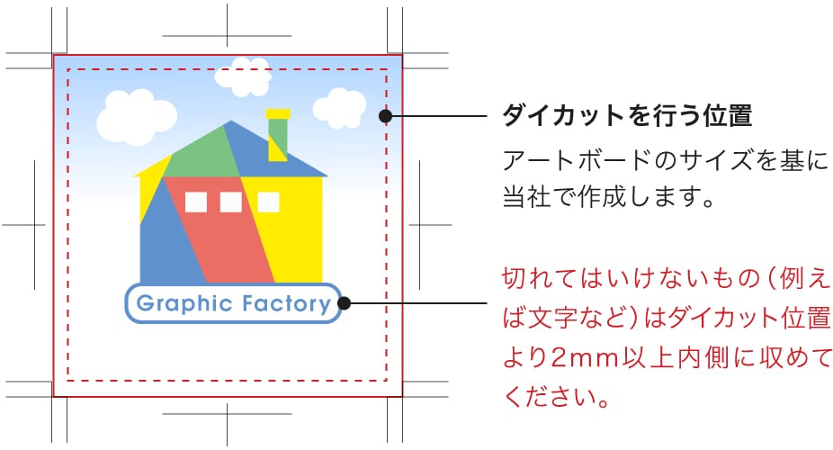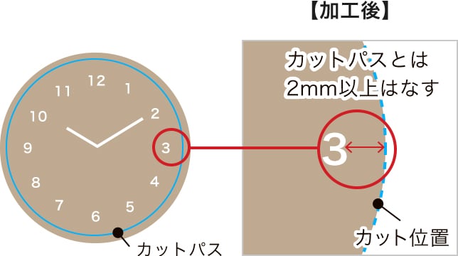 カットのズレにより文字や絵柄が切れる恐れがあるため、カットパスとは2mm以上あけて作成してください。