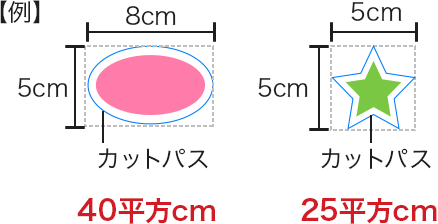 | サイズ | 25平方cm~900平方cm(1辺の最小長さ15mm以上)。 1枚あたりの面積は、図のようにカットパスのいちばん外側を囲んだ枠のタテ×ヨコで計算します。 塗り足し部分は面積に含まれません。 ![]() |