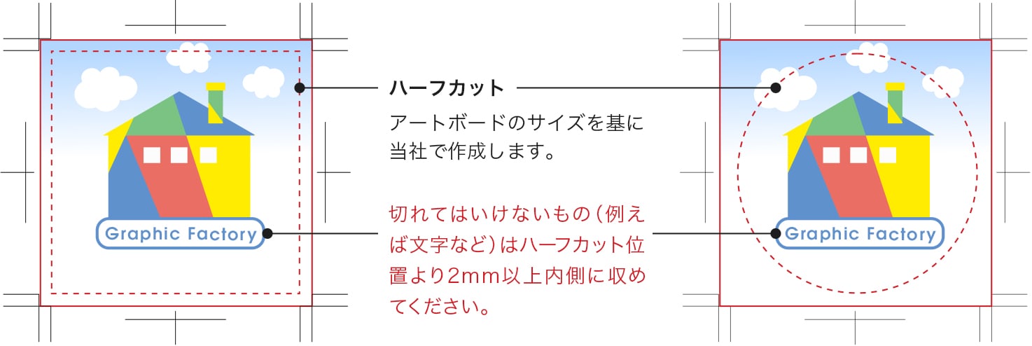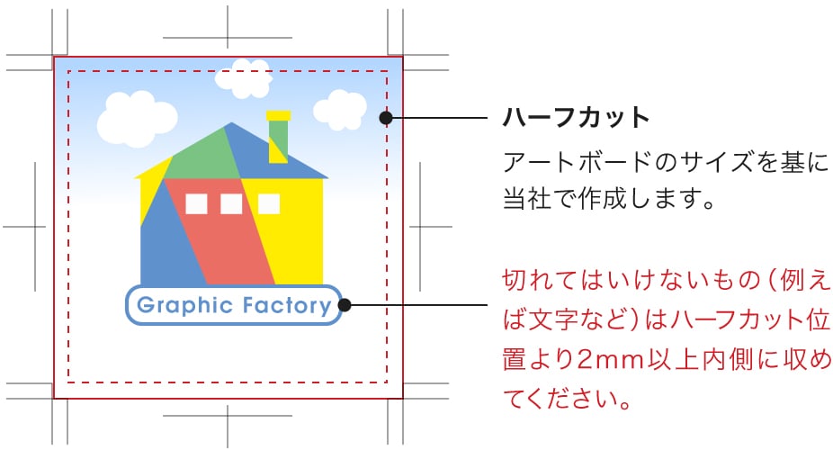 ハーフカットパスは、注文時に選択いただいた形状とサイズをもとに、当社で作成いたします。ただし、ご入稿データにパスが作成されている場合はそちらを優先いたします。