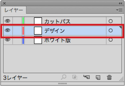 レイヤーがまとめられていると、デザインとカットパスの区別ができません。デザインにカットパス罫線が入っている場合、そのまま印刷されてしまいます。