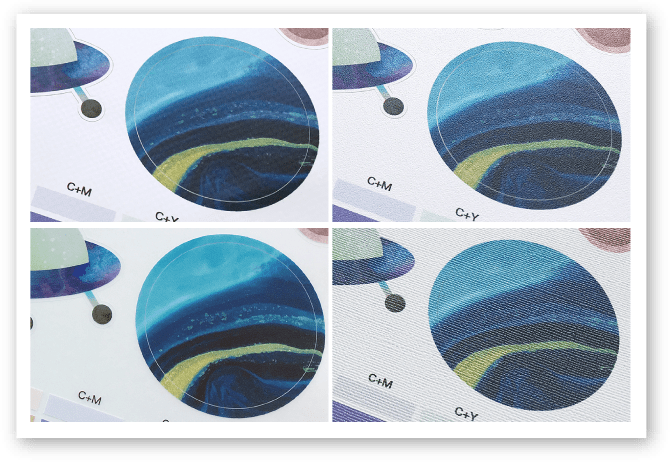 ホワイト版にもとづいて白インクで印刷し、次にフルカラー印刷を行うと綺麗に仕上がります。