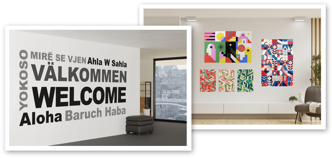 ウォールステッカーは透明な素材への印刷もOK。白インクの上に印刷することで下地の影響を受けにくく、自由度の高いデザインが可能です。貼る対象を透けさせたい場合もおすすめです。