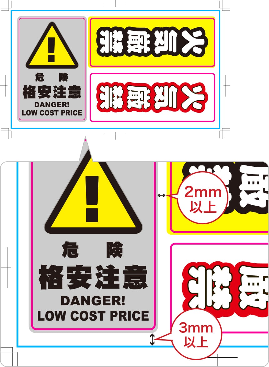 カットパスの外側に2mm以上の塗り足しを設けてください。また、切れてはいけないもの(例えば文字など)はカットパスの2mm以上内側に収めてください。