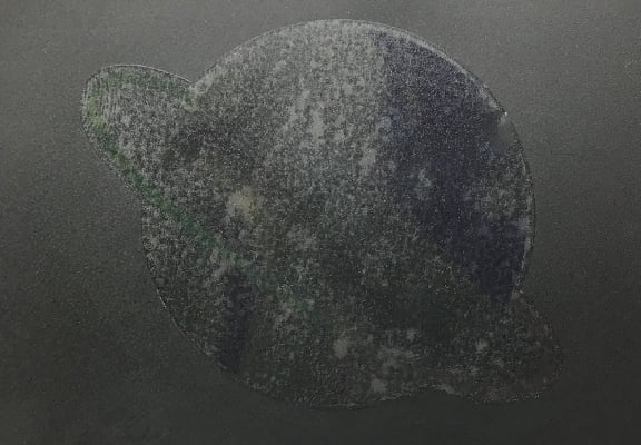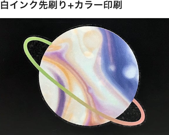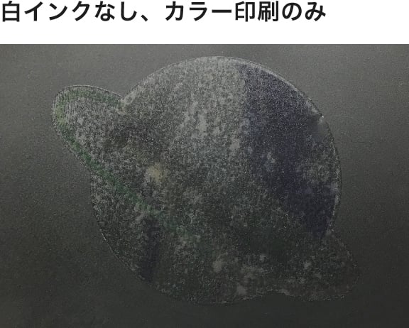 白インクがなければ下地が透けてしまい、絵柄が目立ちません。ステッカーが表面から透けて見える仕上がりになります。