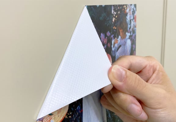 中強度の一時接着用途で、剥がしても下地を傷めにくいタイプです。ただし、時間が経つと粘着力が高まるため、剥がす際に壁の素材によっては一部剥がれる可能性がございますのでご注意ください。また、貼る素材/材質、使用される状況によっては、うまく貼り付かない場合がございます。あらかじめ校正などでお試しいただくこともご検討ください。