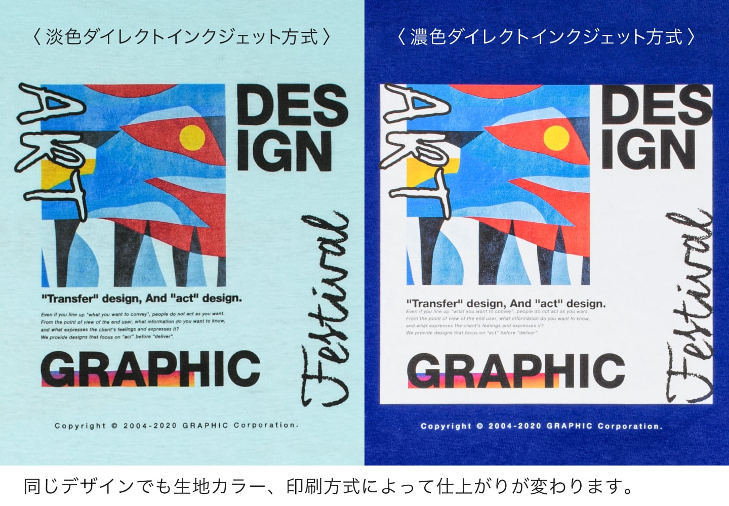 同じデザインでも生地カラー、印刷方式によって仕上がりが変わります。