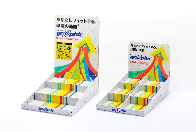 テーブルやワゴンの上に注目を集めることができる紙製のディスプレイツール。