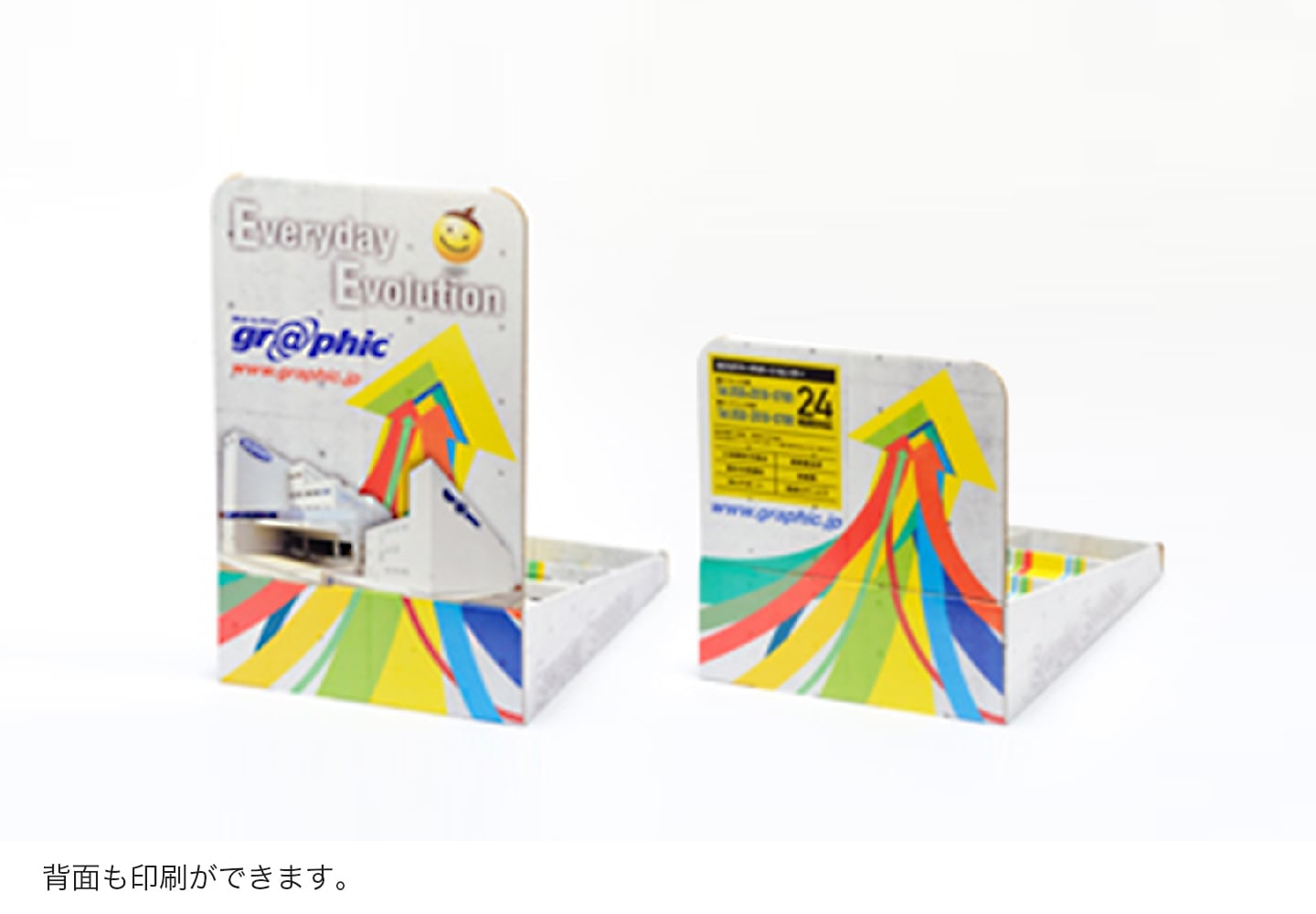 背後の広告ボードは両面を自由にデザインできるので、簡単にオリジナルツールが完成します。少しツヤのある白地の段ボール表面は、複雑な絵柄や写真もきれいに印刷OK。本体は糊を使わず簡単に組み立てることができ、軽いので移動や収納にも便利です。