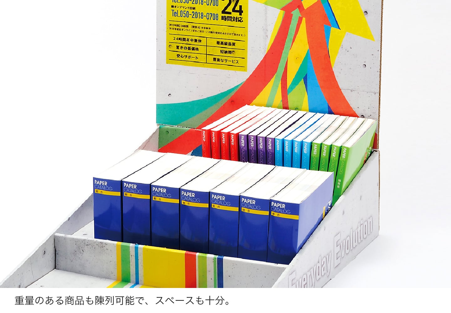 店舗やイベント会場などで、テーブルやワゴンの上に注目を集めることができる紙製のディスプレイツール。丈夫な構造で、ある程度の重量の商品でも乗せることができます。