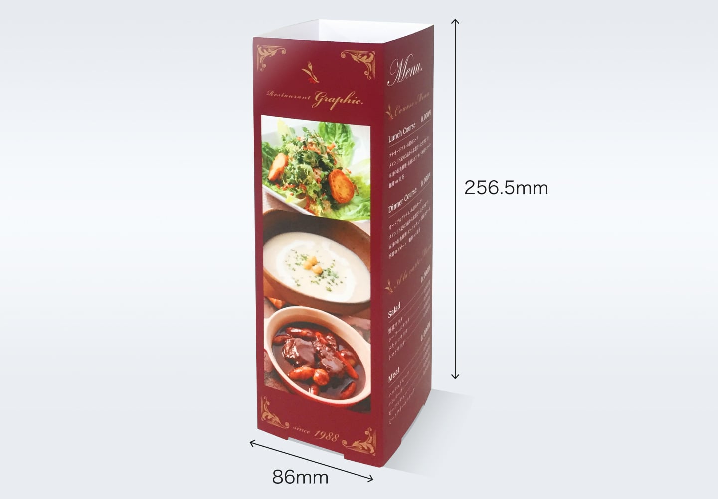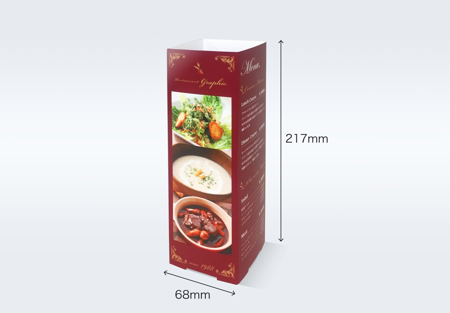 4面分のデザイン面積は程よい大きさで、写真を大きく使用したり、広告物の説明もしっかりできるので、使い方次第で様々なアレンジが可能です。卓上では、これ一つでターゲットへのアピールは十分です。