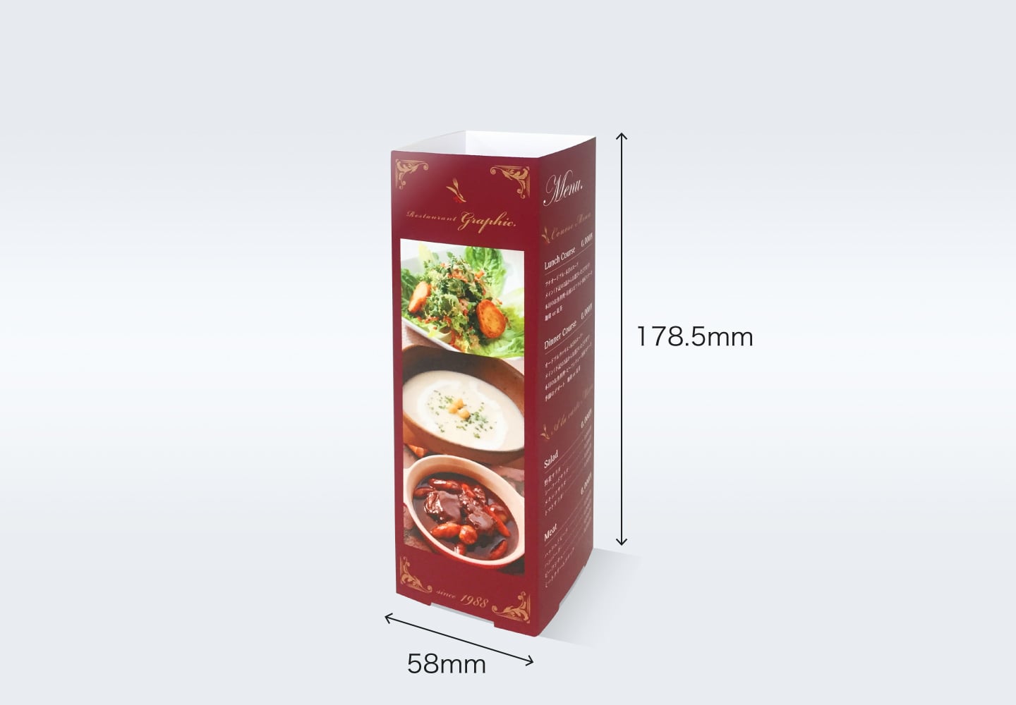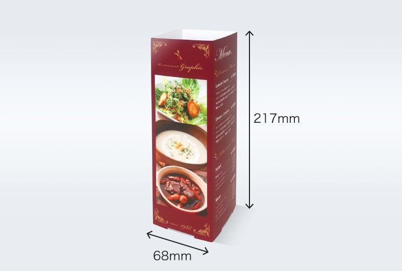 四角柱POPは4面で直立するため、安定感も抜群です。季節商品の案内やキャンペーンの告知、また、カレンダーや会員登録説明など、アイデア次第でさまざまなツールとして活躍します。大量のPOPを期間ごとに入れ替えても、紙製だから手軽でローコストです。