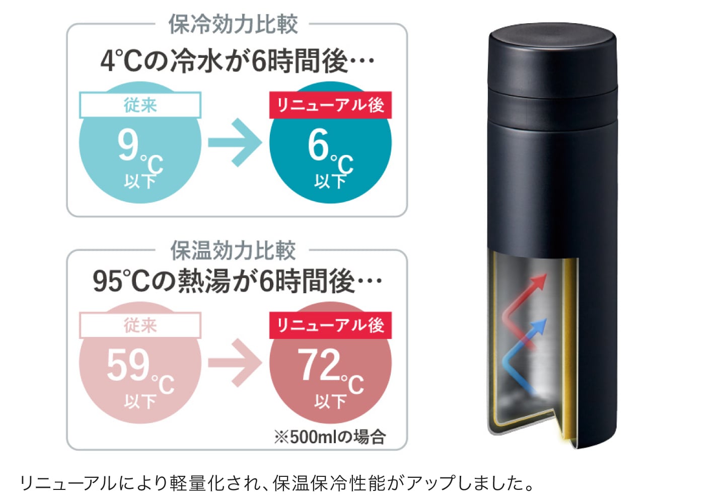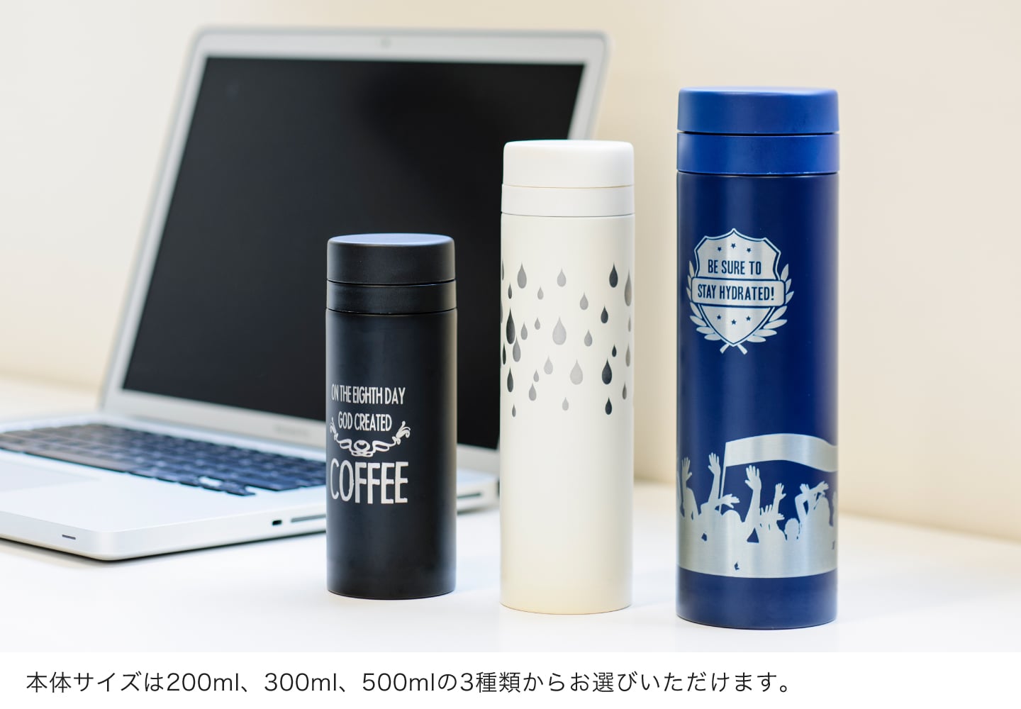 | 商品特徴 | 個人用からノベルティなど、様々なシーンで活用できます。外出時の水分補給に。保冷・保温ができる真空二重構造なので、長時間「飲みごろ」の温度をキープしてくれます。