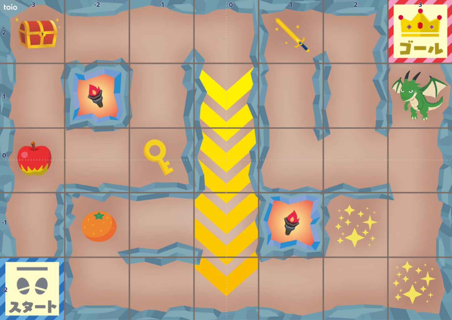toioのキューブをタブレットなどの矢印キーやプログラミングで動かし、ダンジョン迷路をクリアしよう!スムーズにクリアできるようになれるかな?!