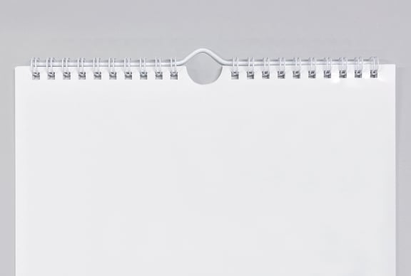 1部からご注文いただける壁掛けタイプのリング綴じ壁掛けカレンダー。リングで綴じられているため、終わった月を破ることなく使用できます。