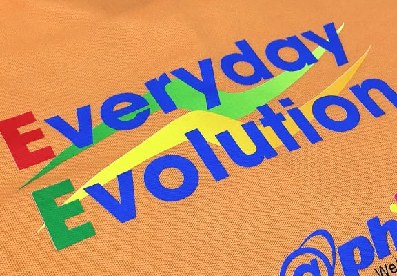 フィルムプリント方式鮮やかな発色、耐久性も抜群!特殊なフィルムにCMYK+ホワイトインクで印刷し、生地に熱転写しフィルムを圧着します。 〈対応生地カラー〉