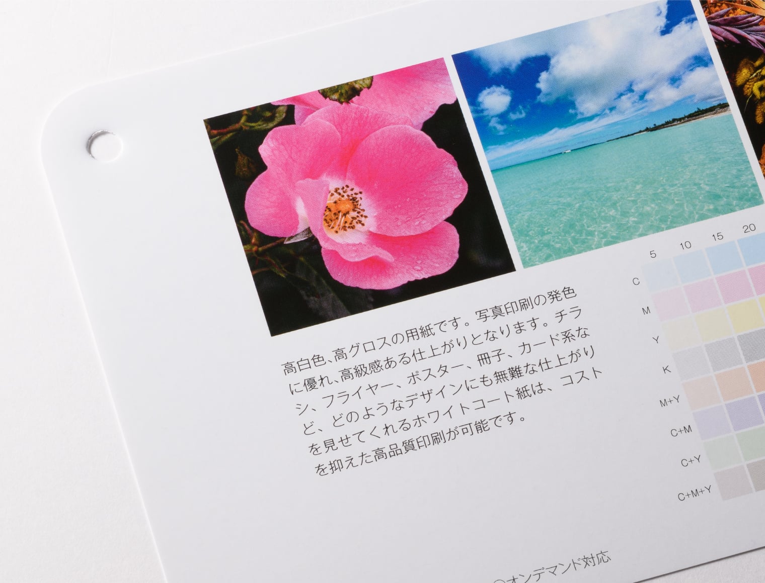 高白色、高グロスの紙です。写真印刷の発色や仕上がりに優れ、高級感ある印刷仕上がりを実現します。