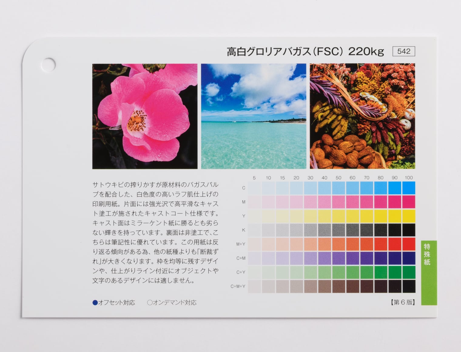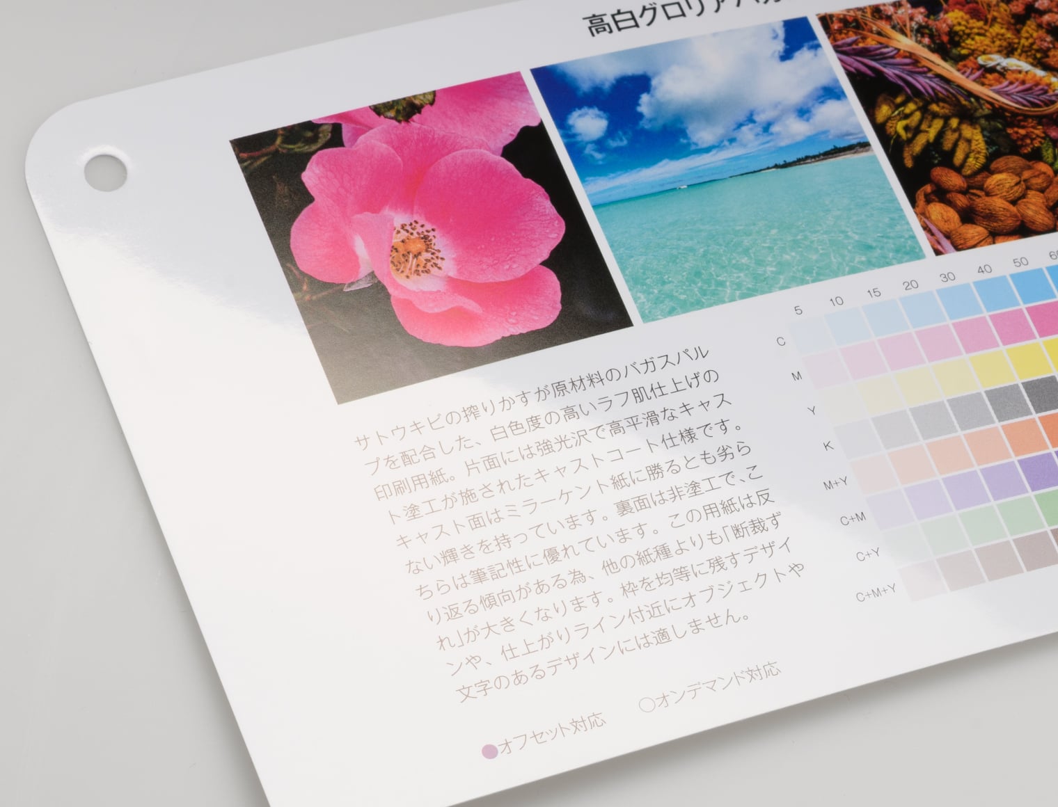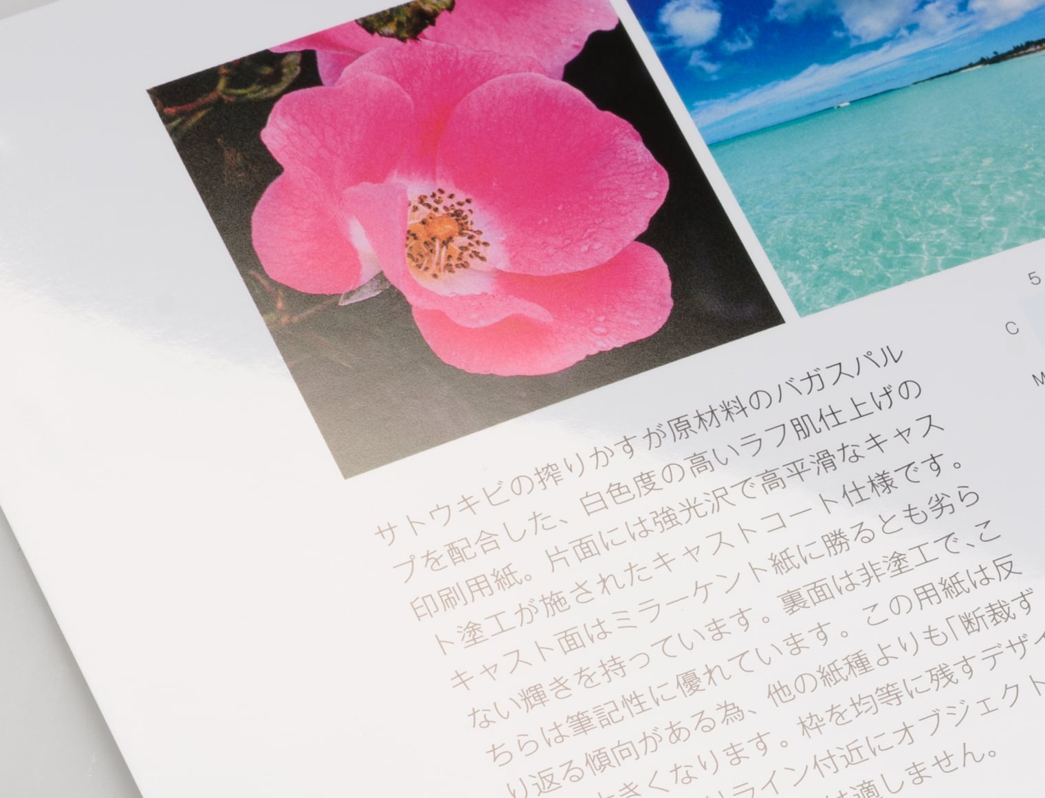キャスト加工は「ミラー加工」と呼ばれることも多いですが、当社では複数の種類のミラー加工紙を取り扱っており、おかげさまでとても好評をいただいております。その中で「高白グロリアバガス」は、キャスト面は輝度の高いミラーケント紙に勝るとも劣らない輝きを持っていると思いました。 裏面は非塗工となりますが、こちらは筆記性に優れた一面を持っています。あと、高白の名がつくだけにとにかく白い!