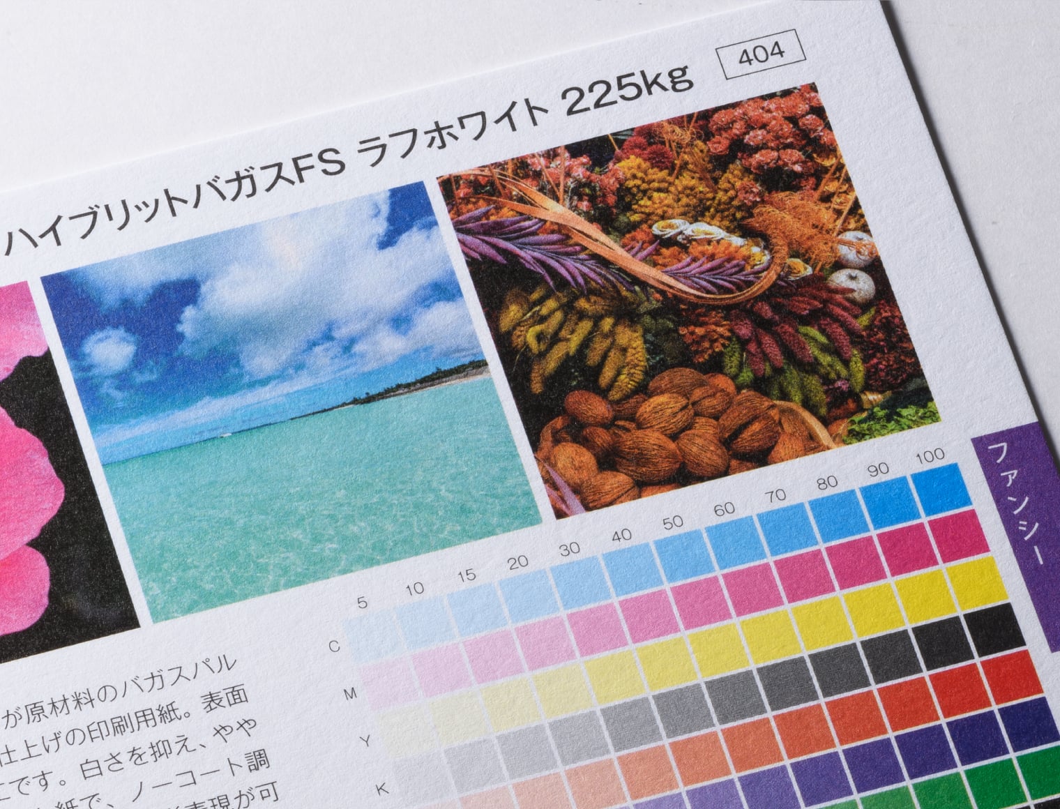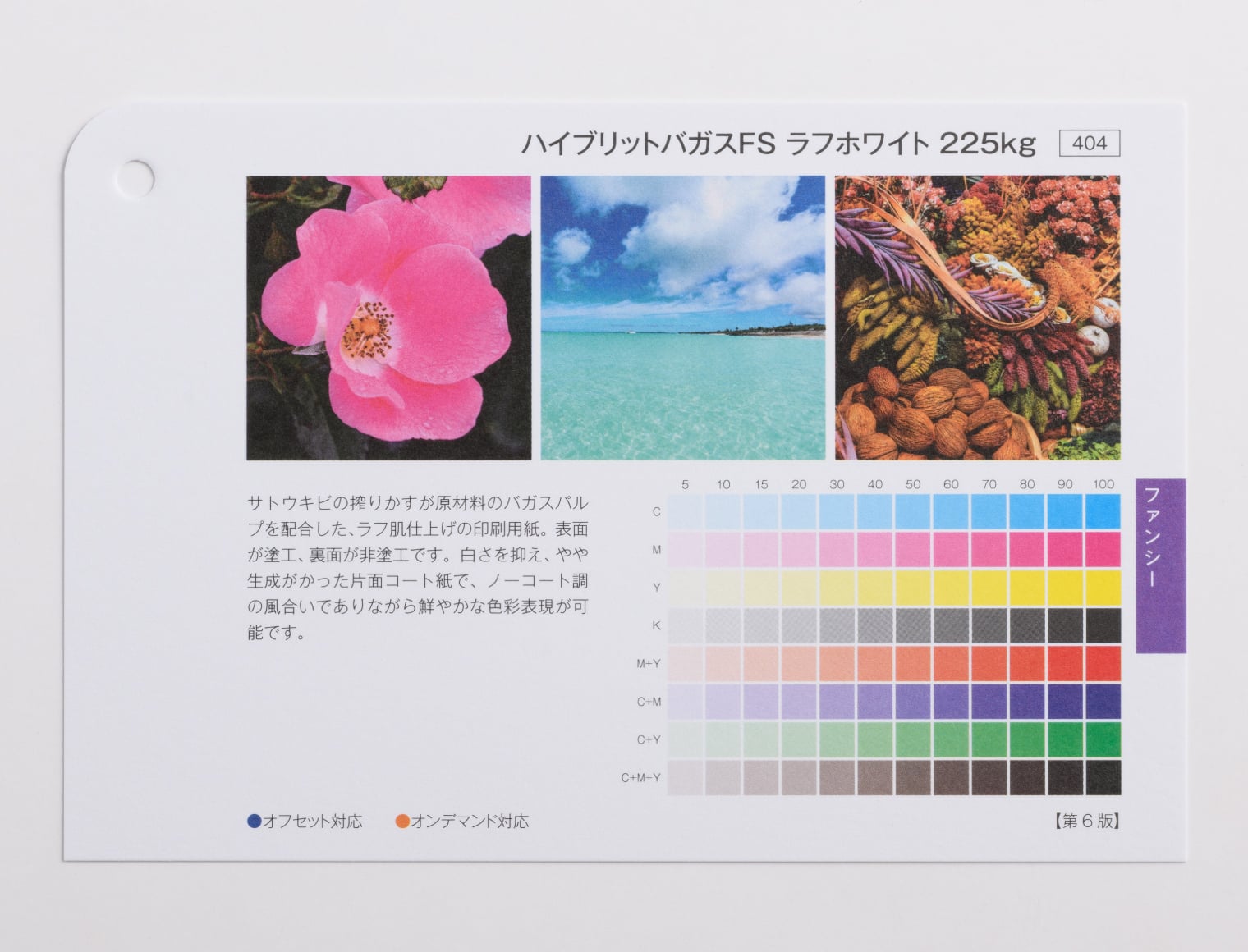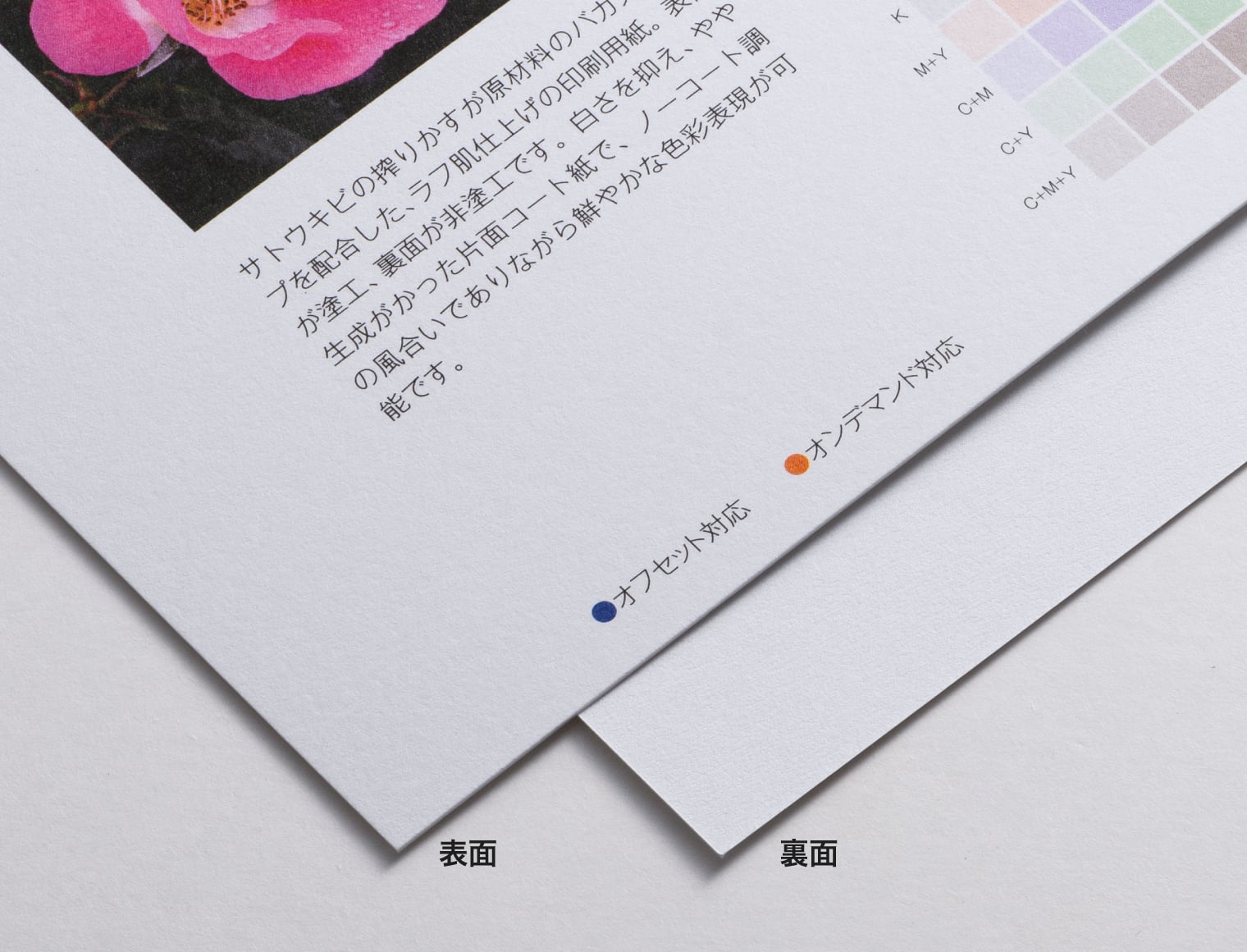 サトウキビの搾りかすが原材料のバガスパルプを配合した、ラフ肌仕上げの印刷用紙。片面が塗工、裏面が非塗工となり、白さを抑えたやや生成りな色合いの片面コート紙。ノーコート調の風合いでありながら鮮やかな色彩表現が可能です。