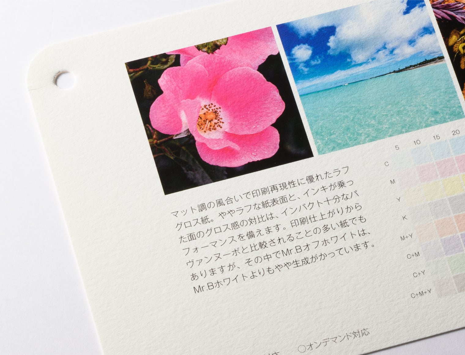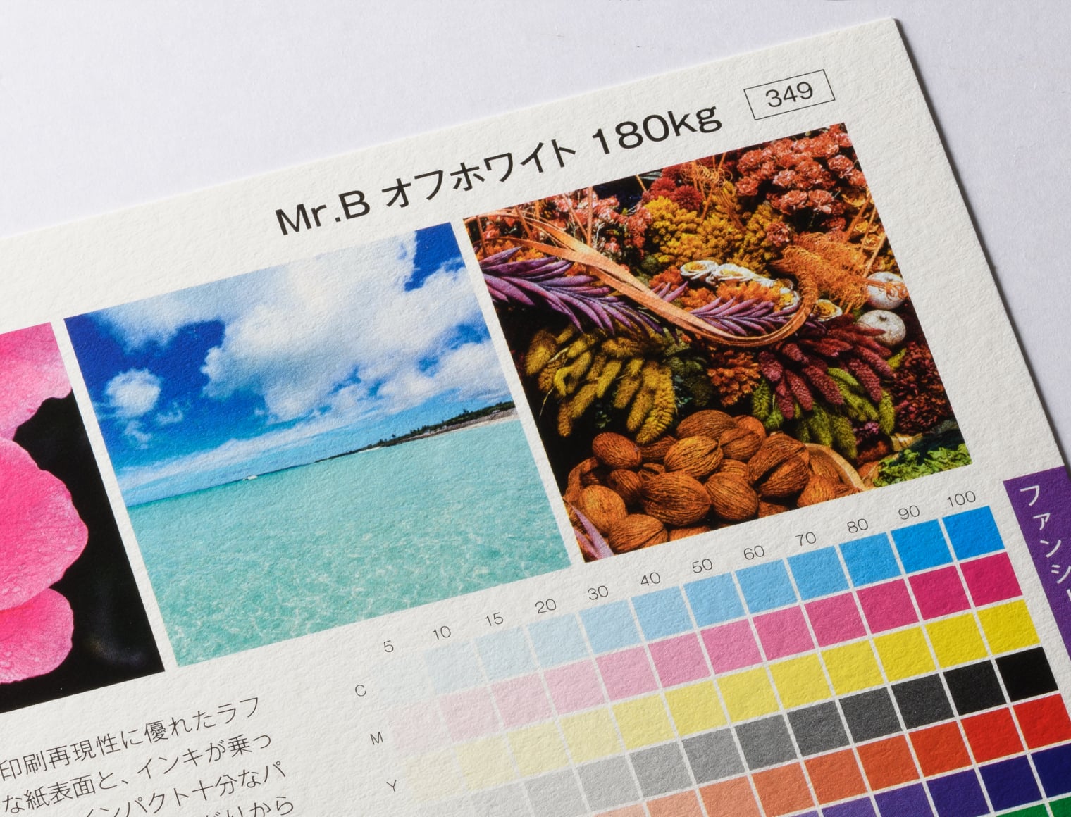 マット調の風合いで印刷再現性に優れています。ややラフっぽい紙表面とインキが乗った面のグロス感の対比は、インパクト十分なパフォーマンスを備えます。その中でMr.Bオフホワイトは、Mr.Bホワイトよりもやや生成がかっています。