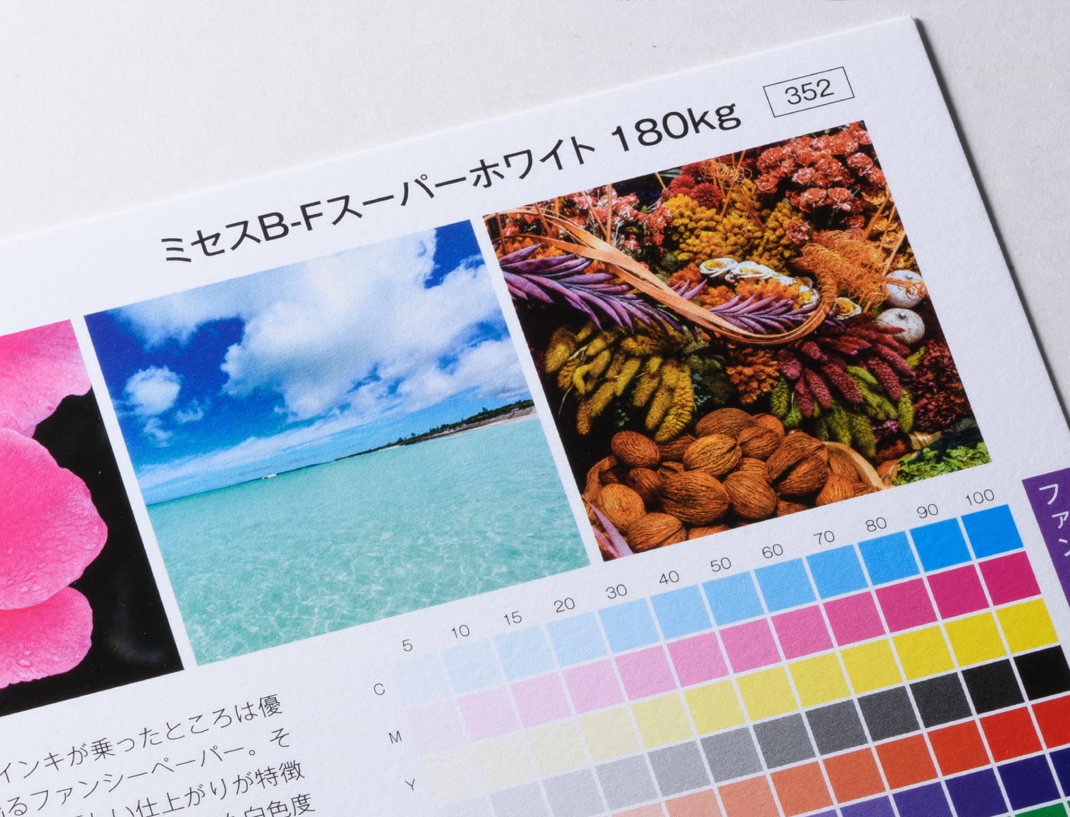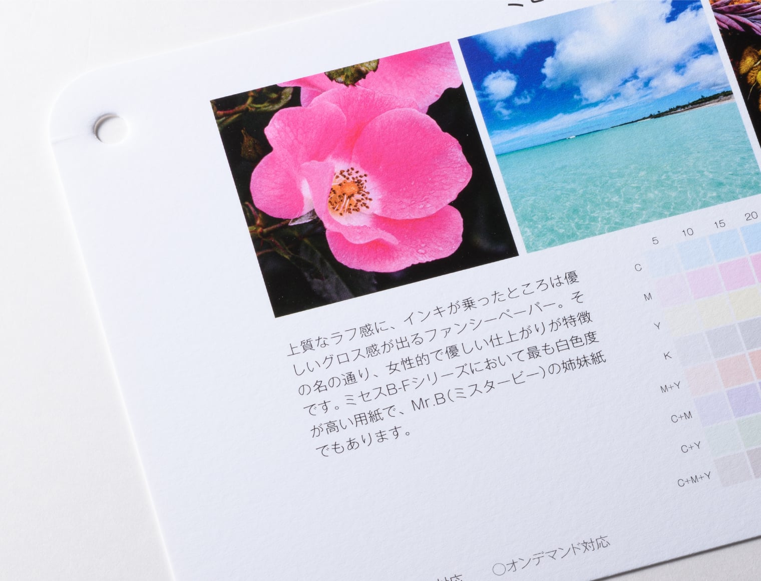 上質なラフ感と、インキが載ったところは優しいグロス感で表現するファンシーペーパー。その名の通り、女性的で優しい仕上がりが特徴です。その中で、ミセスB-FスーパーホワイトはミセスB-Fシリーズにおいて最も白色度が高いのも特徴です。Mr.B(ミスタービー)の姉妹紙でもあります。