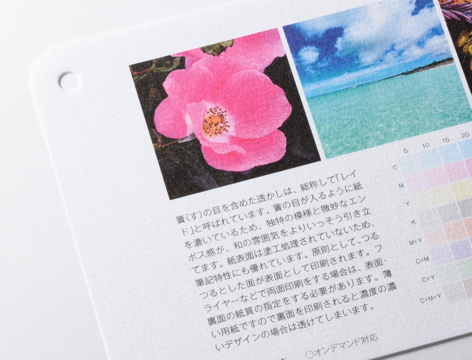 和紙風のレイド紙です。簀(す)の目が入るように紙を漉いているため、独特の簀の目の模様と微妙なエンボス感が、和の雰囲気をよりいっそう引き立てます。紙表面には塗工処理されていないため、筆記特性にもすぐれています。紙全体に簀の目模様が漉き込まれていることを考えると、紙白を多くとってレイド部分を生かせるように、落ち着いたデザインが向いているかと思います。