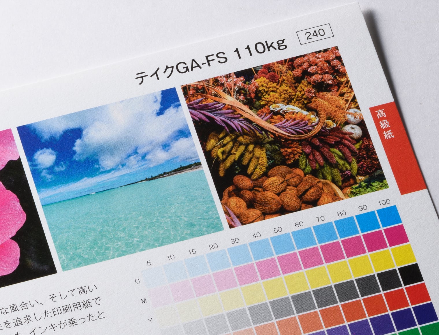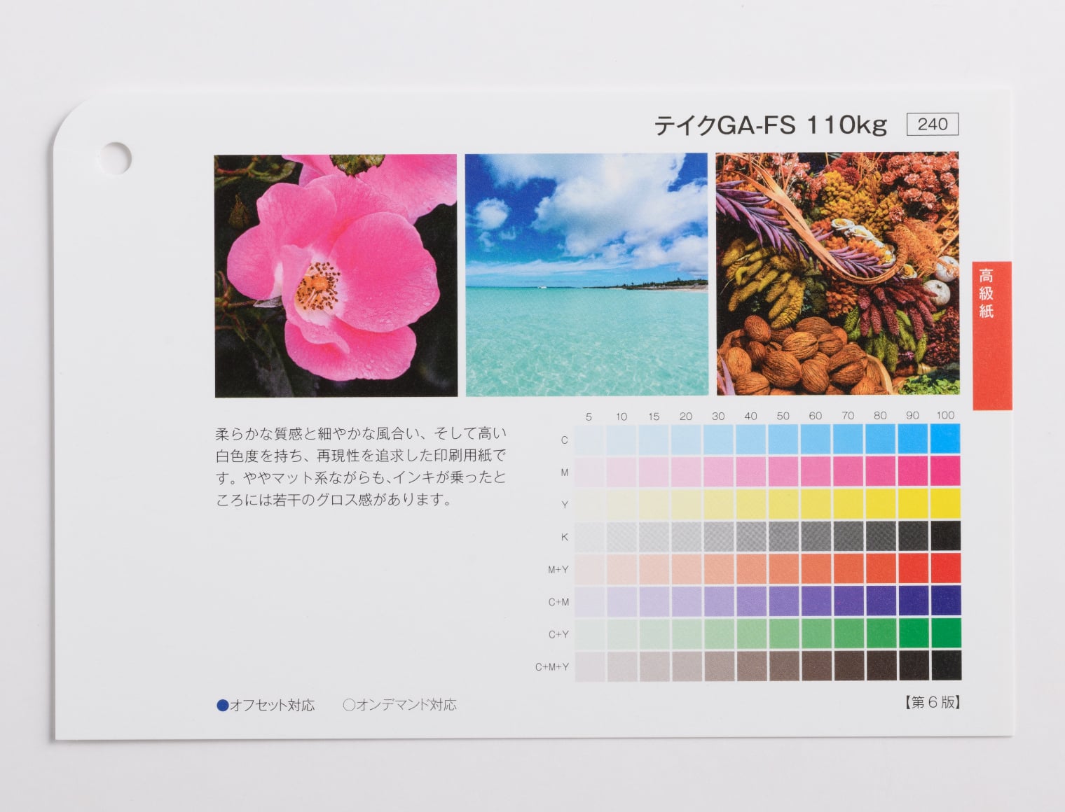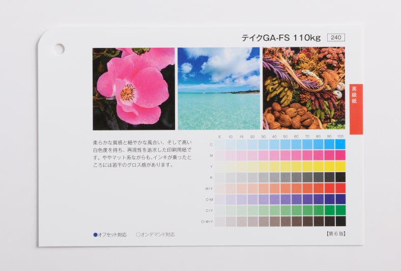 『テイクGA-FS/テイクGAボード-FS』の特徴は、ややマット系ながらも、インキが乗ったところには若干のグロス感を持つことです。また、『ヴァンヌーボVG』や『ミスターB』に似た風合いを持ちつつも、柔らかな質感と細やかな風合いがあります。