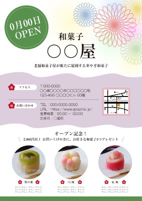 スイーツ・ケーキ屋のチラシ・フライヤー作成に使える「オープン・開店」がテーマの無料デザインテンプレートです。写真や文字を入れるだけで本格的なチラシ・フライヤーが作成できます。編集後はそのまま印刷注文も可能です。