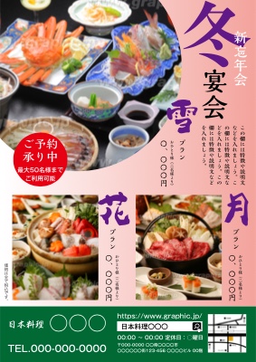 和食・料亭のチラシ・フライヤー作成に使える「オープン・開店」がテーマの無料デザインテンプレートです。写真や文字を入れるだけで本格的なチラシ・フライヤーが作成できます。編集後はそのまま印刷注文も可能です。