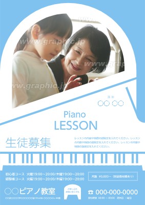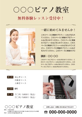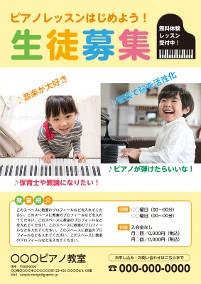 ピアノ教室のチラシ・フライヤー作成に使える「生徒・会員募集」がテーマの無料デザインテンプレートです。写真や文字を入れるだけで本格的なチラシ・フライヤーが作成できます。編集後はそのまま印刷注文も可能です。