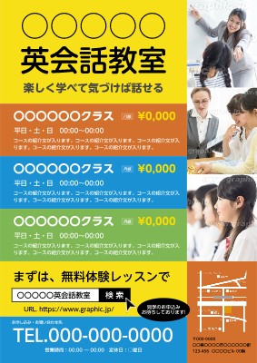 英会話教室のチラシ・フライヤー作成に使える「生徒・会員募集」がテーマの無料デザインテンプレートです。写真や文字を入れるだけで本格的なチラシ・フライヤーが作成できます。編集後はそのまま印刷注文も可能です。