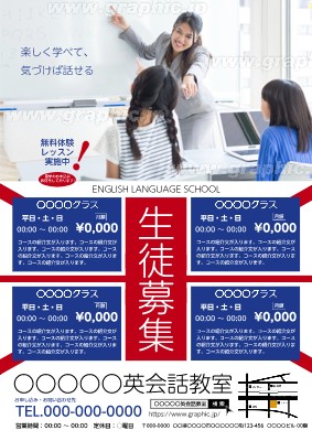 英会話教室のチラシ・フライヤー作成に使える「生徒・会員募集」がテーマの無料デザインテンプレートです。写真や文字を入れるだけで本格的なチラシ・フライヤーが作成できます。編集後はそのまま印刷注文も可能です。