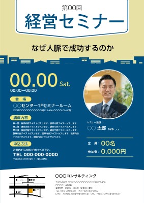 経営のチラシ・フライヤー作成に使える「セミナー・講演会」がテーマの無料デザインテンプレートです。写真や文字を入れるだけで本格的なチラシ・フライヤーが作成できます。編集後はそのまま印刷注文も可能です。